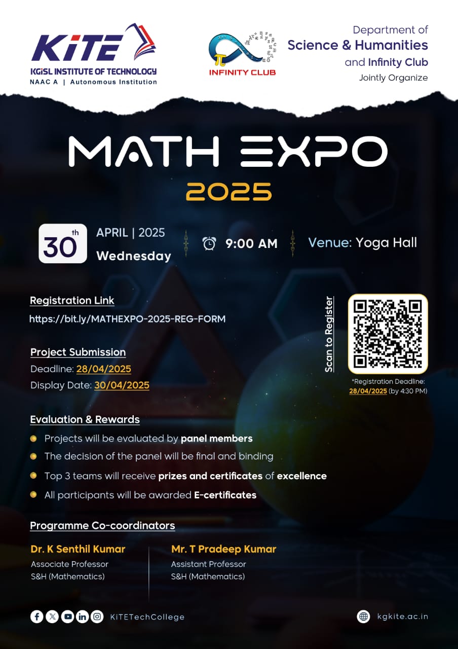 Math Expo 2K25 is an exciting intra-college event organized by the Department of Science & Humanities at KGiSL Institute of Technology, set for April 30th, 2025. The expo showcases the creative and practical side of mathematics through 4 engaging tracks designed to spark curiosity and innovation. From visual displays and working models to interactive demos and challenges, it’s a platform to explore real-world math applications. Math Expo 2K25 is a platform to learn, present, and inspire. Ready to uncover the power of math beyond the classroom?